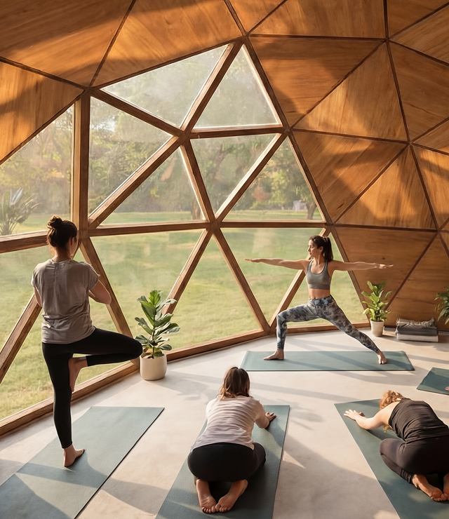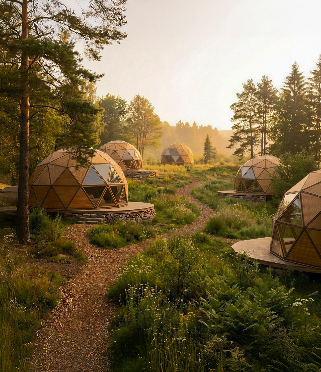 O diâmetro e a altura são definidos caso a caso — desde refúgios compactos até soluções para eco-resorts. Ajudamos a propor medidas ideais para o uso, o terreno e a regulamentação local. Os tamanhos mais comuns variam de 3 a 30 metros de diâmetro.
