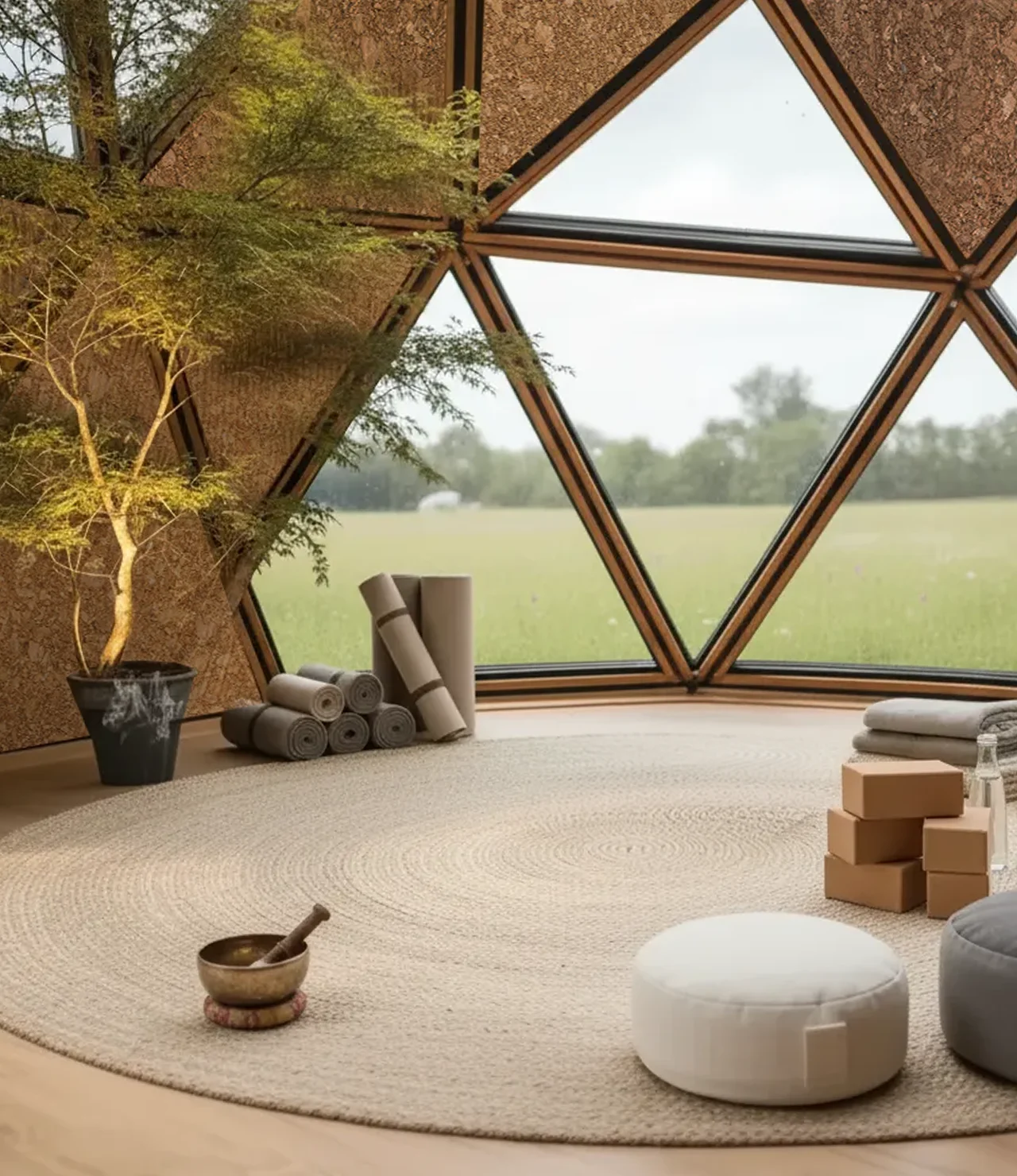 Pelo uso de materiais naturais e recicláveis (como a cortiça), pela pré-fabricação que reduz desperdício, pela eficiência térmica e por fundações de baixo impacto. Menos recursos, mais conforto.